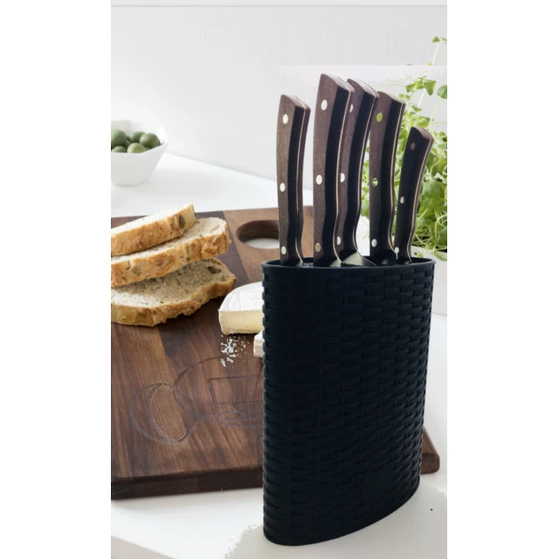Si vous aimez cuisiner, et que vous passez de nombreuses heures derrière les fourneaux, optimisez votre temps avec un bloc couteaux posé votre plan de travail. L’avantage? Vous avez vos couteaux de cuisine à portée de main. Plus besoin d’ouvrir un tiroir et d’y rechercher tel ou tel couteau. Avec un bloc de rangement couteaux, vous n’avez qu’à tendre le bras et saisir le manche d’un des 5 couteaux qu’il renferme. Ce bloc à couteaux est tressé pour plus d’élégance.