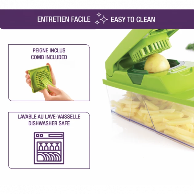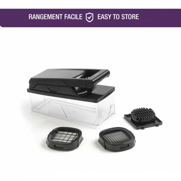 Coupez et tranchez tous les types de lĂ©gumes ! RĂ©alisez facilement et rapidement 3 tailles de dĂ©s et bĂątonnets de lĂ©gumes (pommes de terre, courgettes, carottes, concombres…) avec ce coupe lĂ©gumes. Son rĂ©servoir permet de stocker les lĂ©gumes dĂ©coupĂ©s et permet Ă l’appareil d’ĂȘtre utilisĂ© sur des espaces de travail rĂ©duits sans salissures. ĂquipĂ© d’une poignĂ©e ergonomique et d’une base antidĂ©rapante, le tranche-lĂ©gume est trĂšs facile et sĂ»r Ă utiliser.