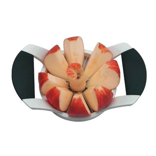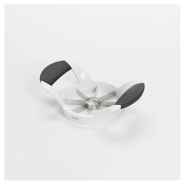 Pour préparer salades de fruits et tartes aux pommes plus facilement, servez-vous du coupe-pommes OXO. Cet instrument si pratique et ergonomique est équipé de deux poignées confortables et d’une sorte d’emporte-pièce qui découpera vos pommes et autres fruits en 8 parts égales tout en séparant le trognon du reste.